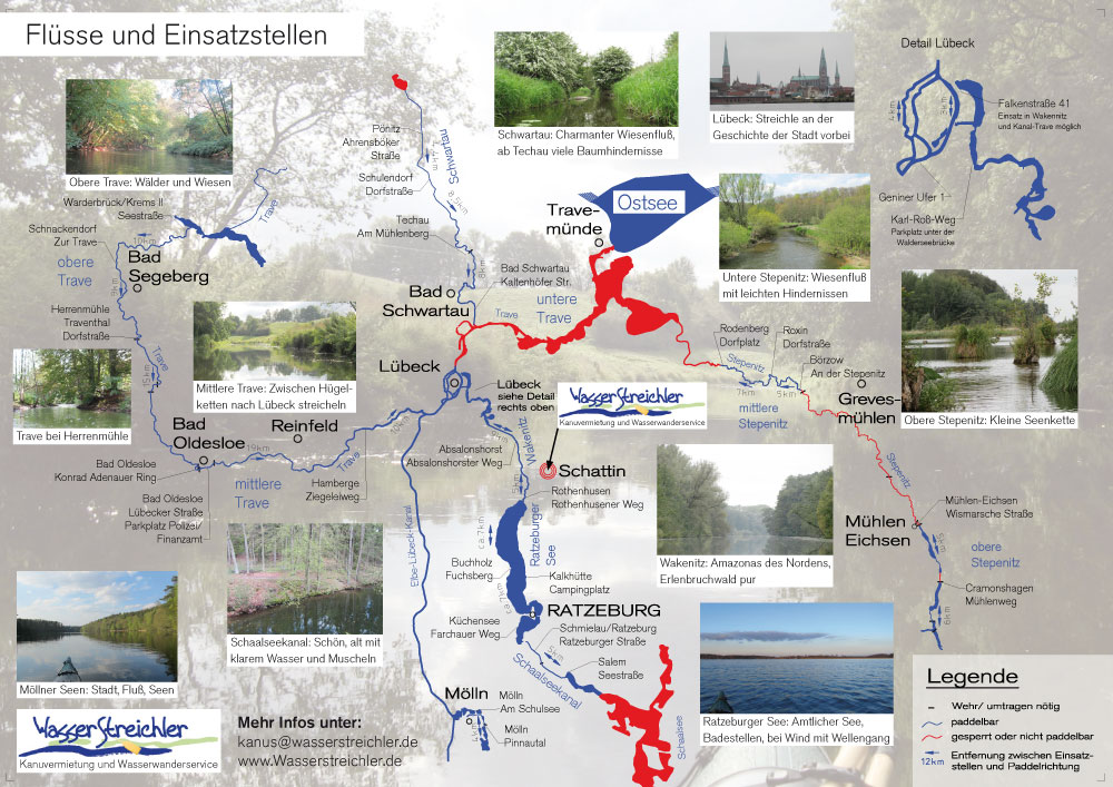 Für Erstpaddler empfehlen sich die Wakenitz, mittlere Trave, Lübecker Altstadt, die Möllner Seen, der Ratzeburger See bei wenig Wind,der Oberlauf der Stepenitz, die Schwartau bei Techau und der Schaalseekanal. Diese Gewässer sind breit und besitzen keine oder nur sehr geringe Strömung.